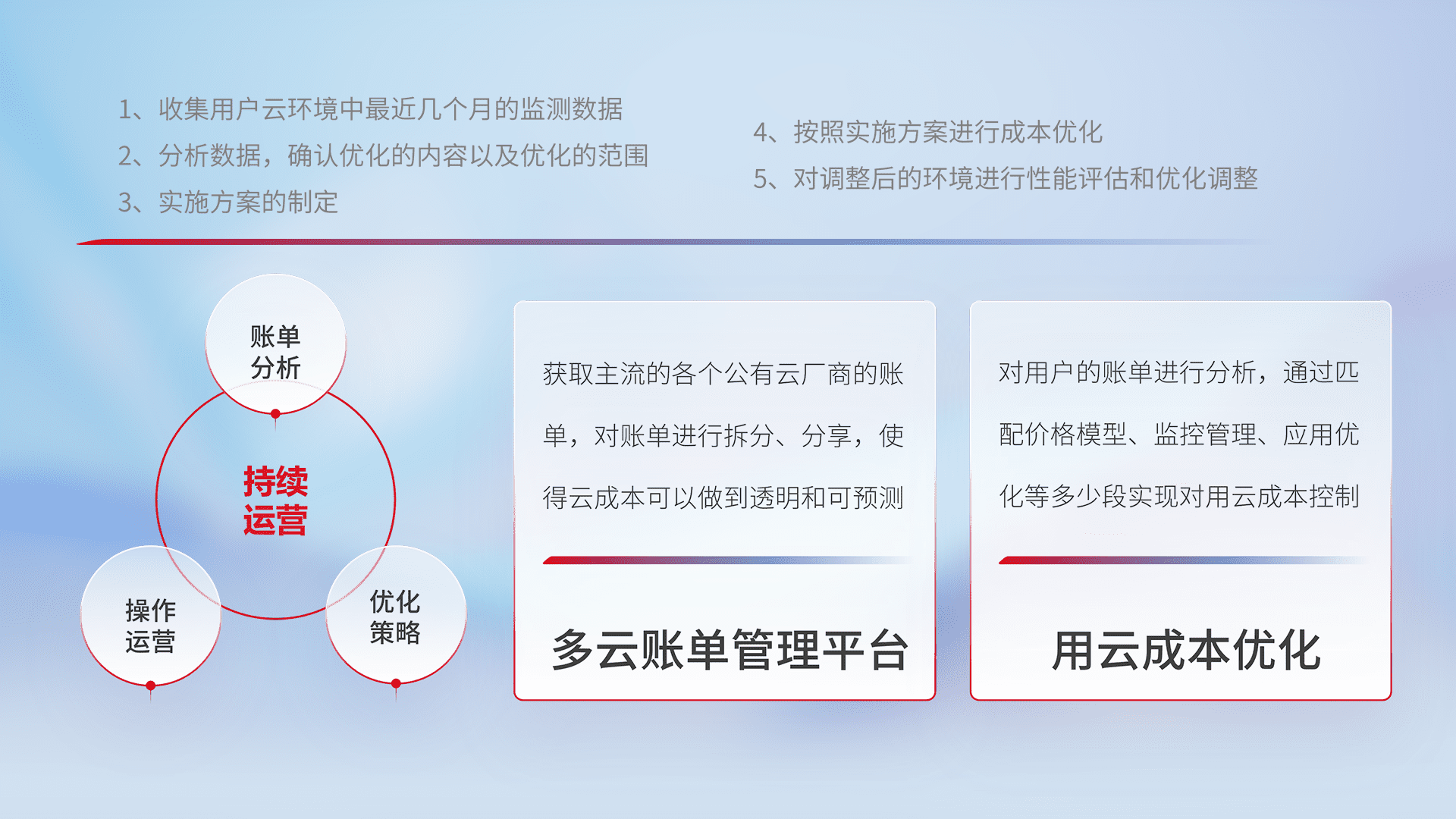 通过多云纳管,,,以统一的资源数据模型把客户的云资源进行抽象和封装,,,进而实现对多云资源的统一操作,,,,保障云资源管理的可靠性、、、、稳定性与可用性。。。量身定制化运维内容,,,配置、、、开发运维、、、补丁管理、、、备份、、、监控、、、、认证和访问管理、、、审计和日常巡检等,,,,保障在用云过程中的可靠度,,,稳定度以及高可用率。。。。